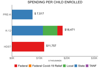 Pre-K programs may receive additional funds from federal or local sources that are not included in this figure. K–12 expenditures include capital spending as well as current operating expenditures. Head Start per-child spending includes funding only for 3- and 4-year-olds.