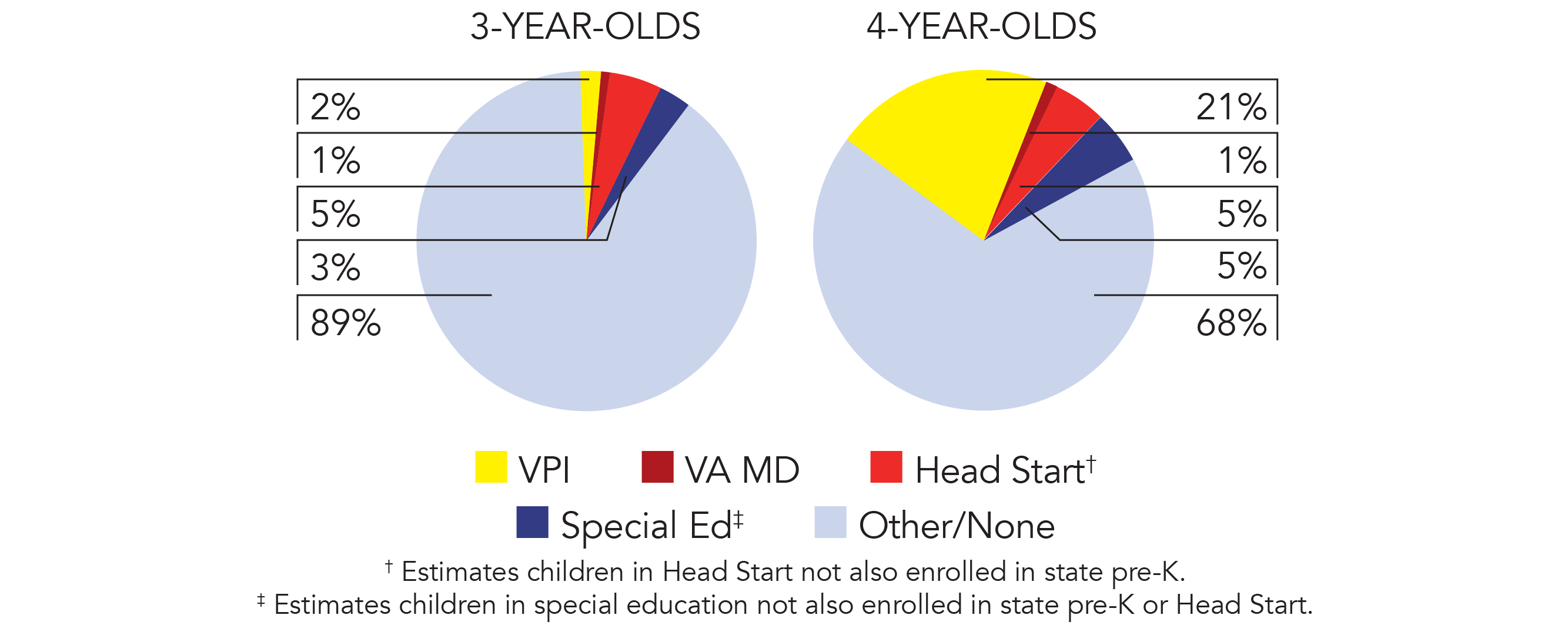 The Virginia Preschool Initiative (VPI) began in 1995 to serve at-risk 4-year-olds not enrolled in existing preschool programs. During the 2023-24 school year, VPI programs operated in 96% of eligible school divisions. Programs are required to operate for a minimum of three hours per day, though 95% of children attend full-day programs throughout the school year. VPI is funded by an annual legislative appropriation of state general funds and a required local match based on the local composite index. The local match is capped at half the per-pupil amount. Funding for VPI is available to school divisions where there are at-risk 3- and 4-year-olds not served by Head Start.