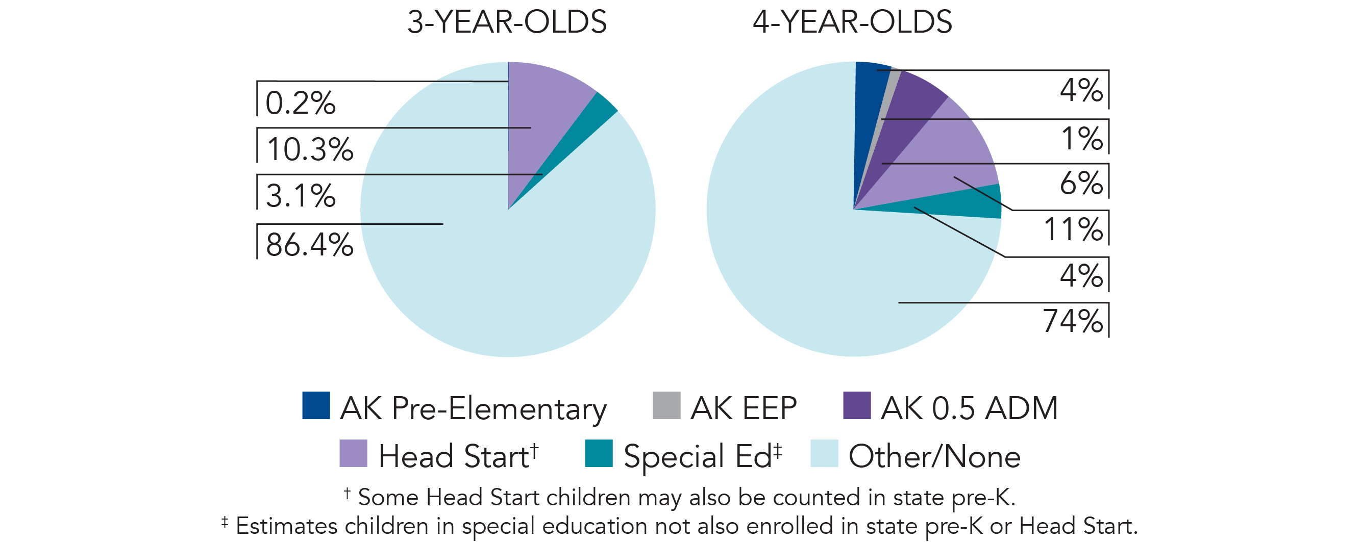 Starting with the 2023-24 school year, the state awarded Early Education Program (EEP) Grants to seven districts, on a 3-year cycle. These districts are working towards meeting Alaska’s Early Education Program Standards. One district, Anchorage, was included in the 0.5 ADM Approval Pre-K program, which includes stable funding through Alaska’s base student allocation formula for 4- and 5-year-old pre-elementary students at 0.5 Average Daily Membership (ADM). In 2024-25, two EEP districts moved to the 0.5 ADM Approval Pre-K Program and two additional districts moved into EEP. EEP districts will continue to shift into the 0.5 ADM program as they meet all the quality components.