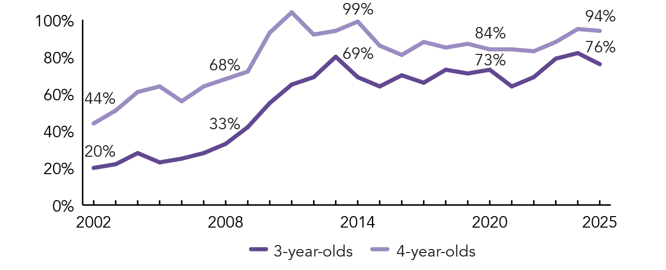 Despite navigating an unprecedented period of fiscal challenges due to Congressional budget actions and reductions to the federal workforce, the District of Columbia continues to prioritize the needs of young children. In addition to investing over $350 million in the Universal Pre-K Program, the District continues to invest in the Early Childhood Educator Pay Equity Fund. This initiative increases wages of educators in licensed child development facilities.