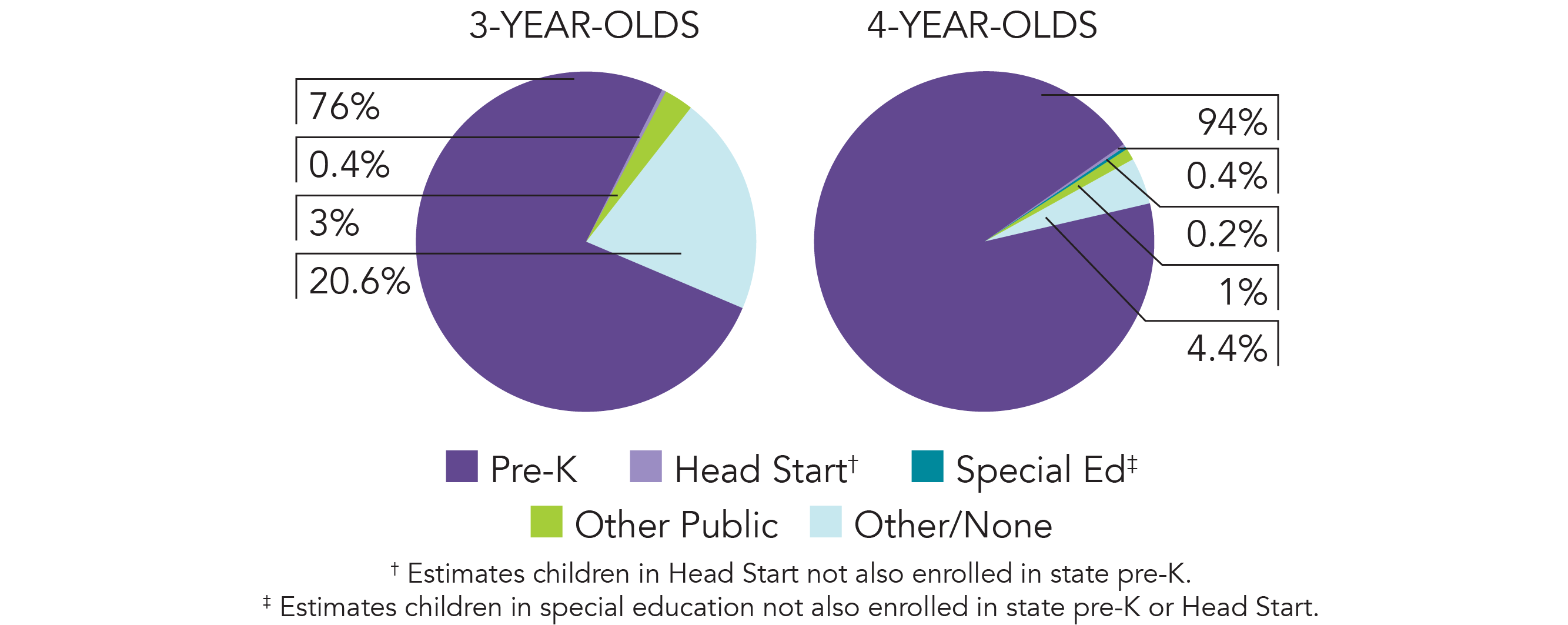 Pre-K programs operate a minimum of 6.5 hours per day, five days a week, 180 instructional days per year. Given the high availability and participation, this program can be considered universal. Funding for public pre-K programs is based on the Uniform Per Student Funding Formula.