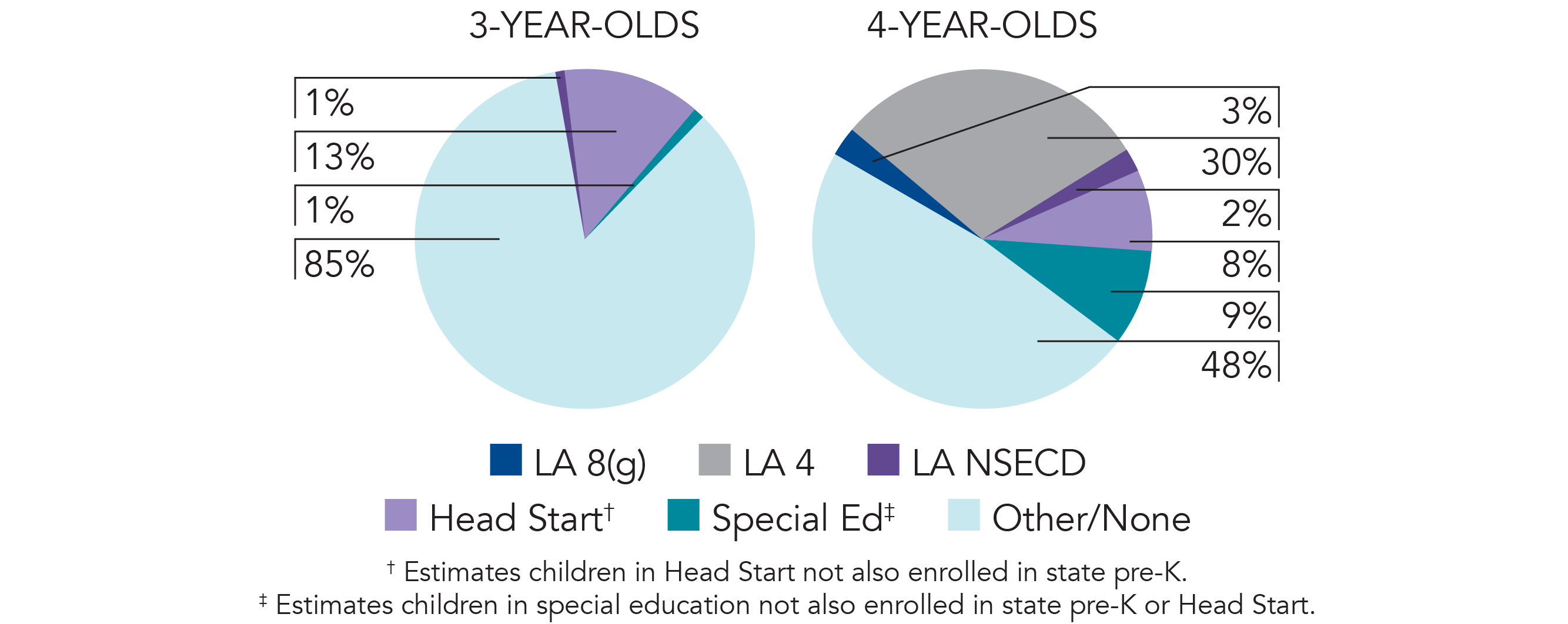 Also established in 2001, the NSECD program supports high-quality pre-K for 3- and 4-year-olds in nonpublic settings. Teachers in 4-year-old classrooms in the NSECD program are required to have a bachelor’s degree and assistant teachers are required to have at least a CDA. NSECD has the same eligibility requirements as the LA 4 program, and funding is available for this program on a competitive basis.