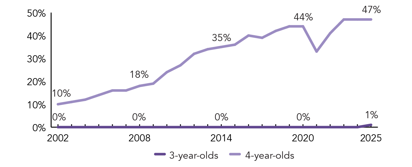 During the 2024-2025 school year, Maine began to legislatively shift responsibility for early childhood education (3- to 5-year-olds) to the public school system over a four-year period, with completion in the 2027-2028 school year. As this shift occurs, the state anticipates that more children with identified disabilities will receive services in a timely manner and that the state will continue to see steady public pre-k expansion.