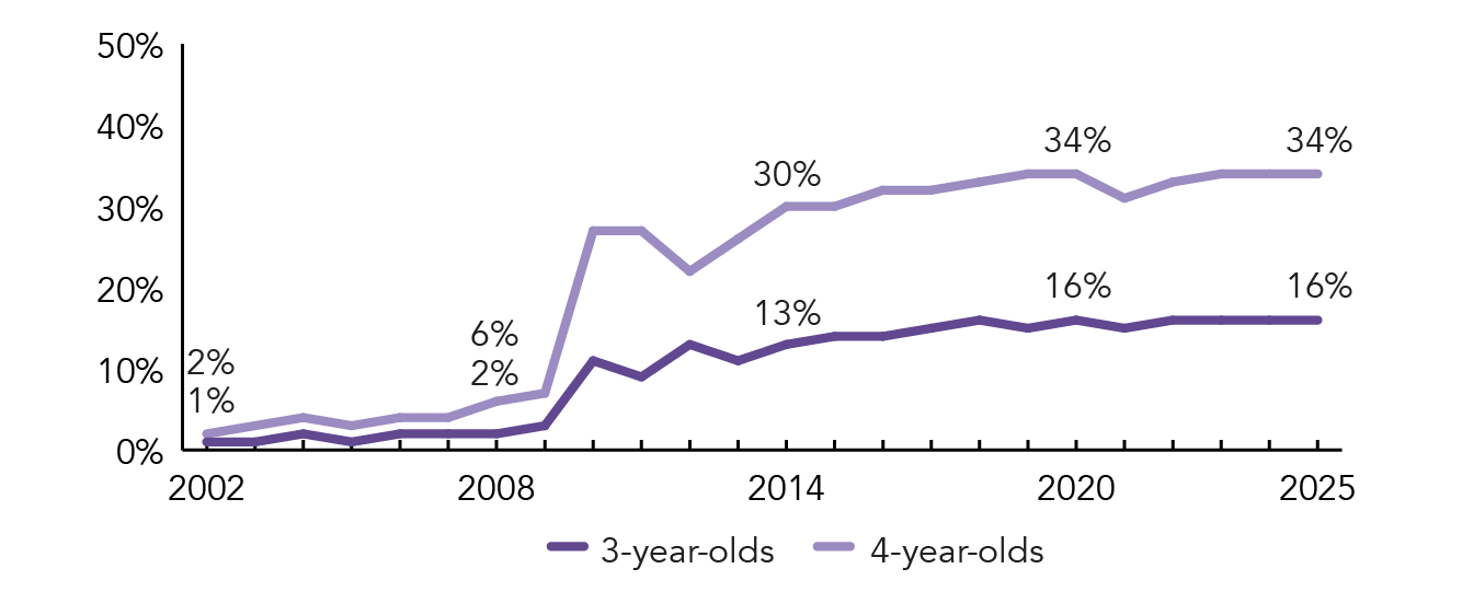 In 2024, legislation was passed to allow districts to enroll kindergarten-eligible children in pre-K until they reach the compulsory attendance age. In response to this change, districts are in the process of creating and implementing policies, and the state will revise the policies and rules for this program.
